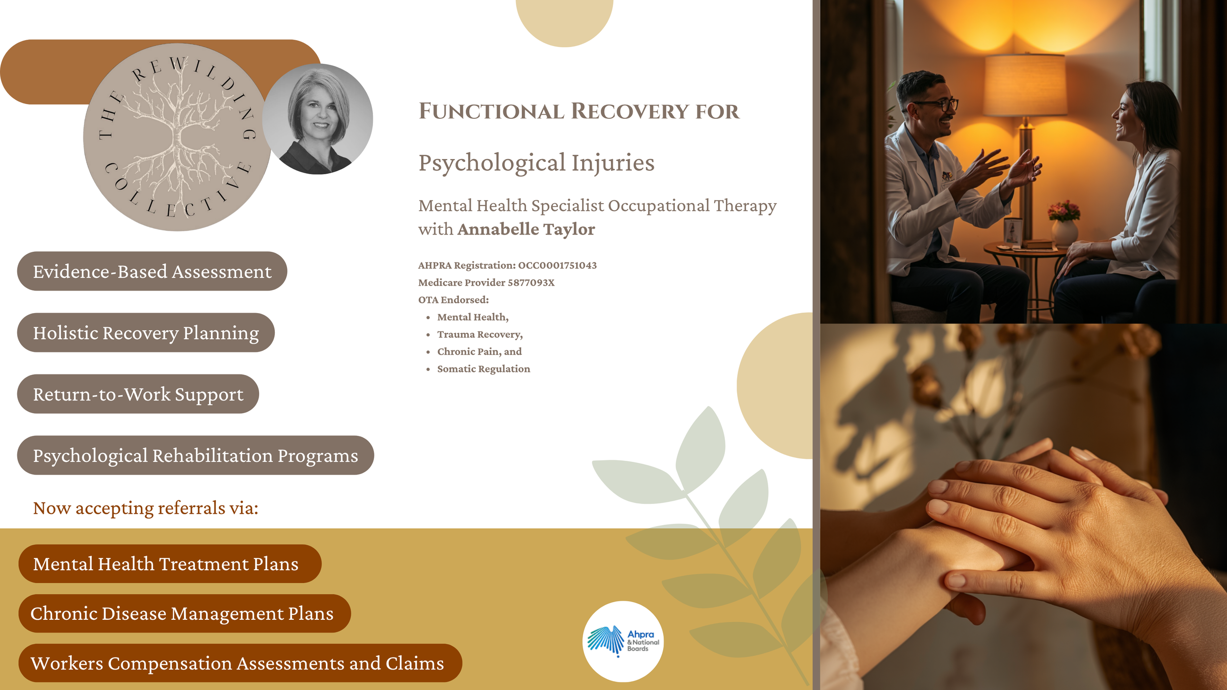 Functional Recovery for Psychological Injury, is a highly specialised, tertiary Return to Work (RTW) intervention delivered by Annabelle, our OT Specialist. Built upon our proprietary Integrated Triadic Convergence (ITC) Model, we do not just treat symptoms; we map the architecture of the human nervous system, meaning-making systems, and relational contexts to restore true functional capacity.